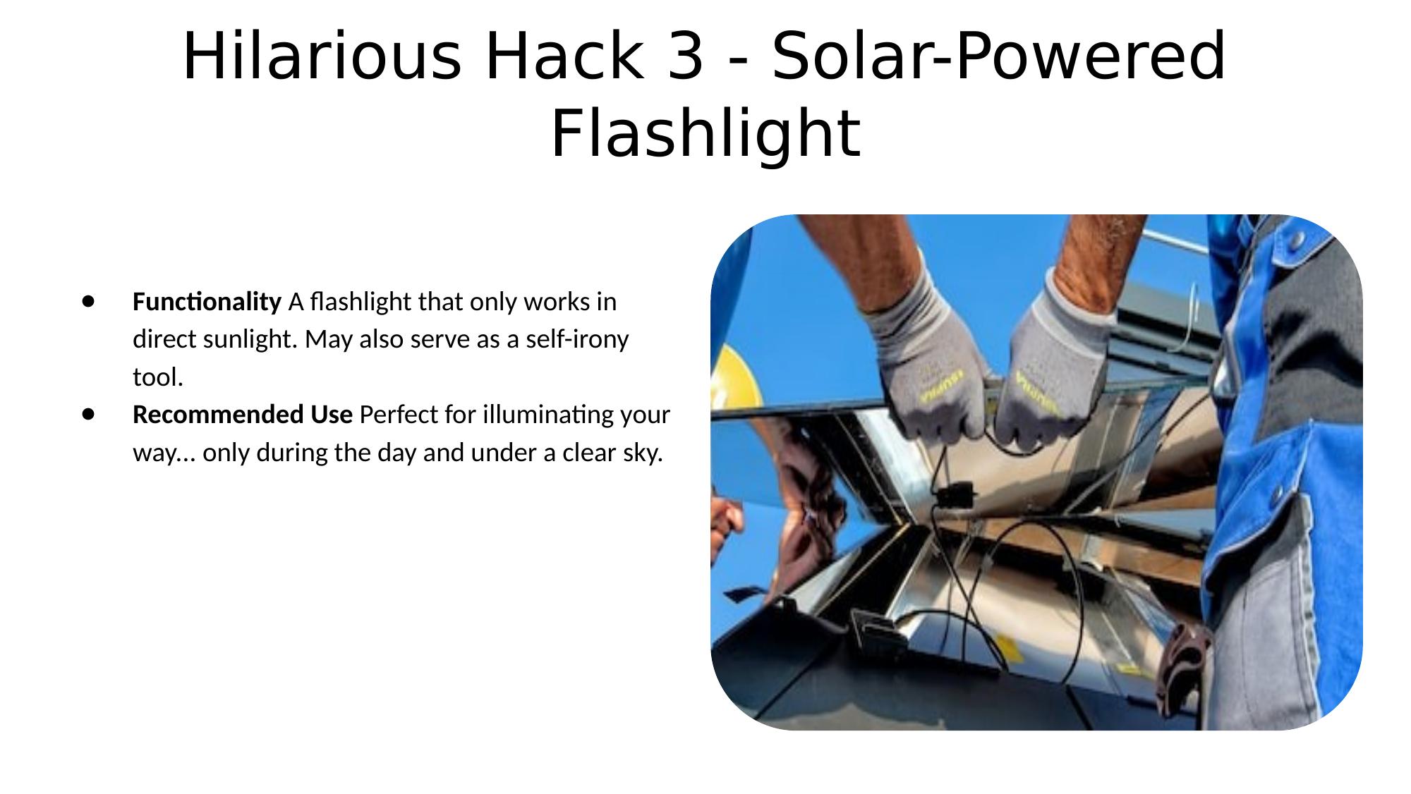 Introducing the solar-powered flashlight, a truly absurd invention that humorously contradicts its own purpose. Who wouldn't want a flashlight that only works when the sun is out?